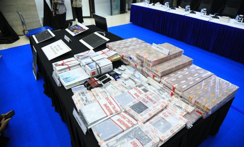 Barang bukti: 32 handphone, 12 SIM card, 9 laptop, mesin EDC, buku rekening, kartu ATM, dokumen perusahaan, hingga perangkat CCTV.