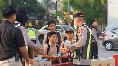 Kapolres Metro Bekasi Pimpin Yanmas Pagi, Bantu Penyeberangan & Bagikan Susu ke Pelajar di Jurong