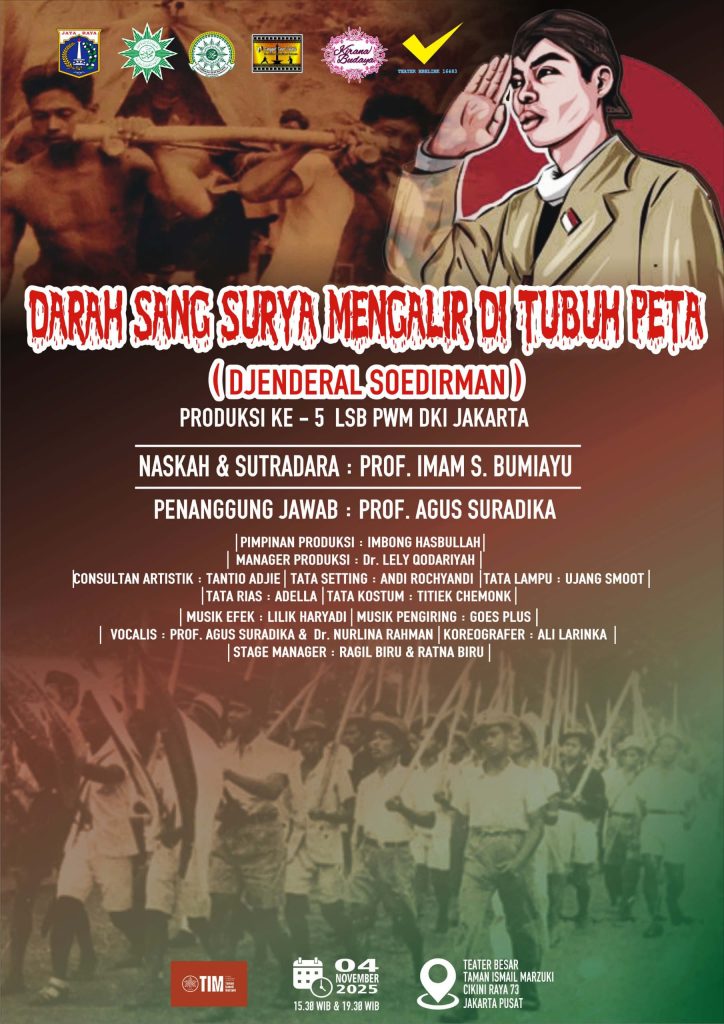 Jakarta, mimbar.co.id — Lembaga Seni Budaya (LSB) Pimpinan Wilayah Muhammadiyah (PWM) DKI Jakarta kembali menghadirkan karya teater bersejarah bertajuk “Darah Sang Surya Mengalir di Tubuh Peta (Djenderal Soedirman)”.