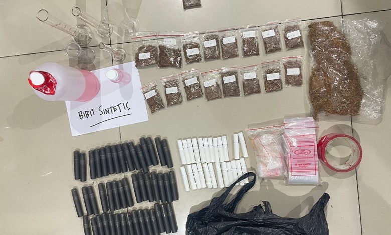 Dalam penggerebekan itu, petugas menyita sejumlah barang bukti, di antaranya bibit sintetis cair sebanyak 534 mililiter, tembakau sintetis seberat 72,1 gram, 73 puluhan botol spray, 5 gelas takar berbagai ukuran, satu botol aseton, satu unit telepon genggam, serta bahan-bahan sintetis yang belum jadi.