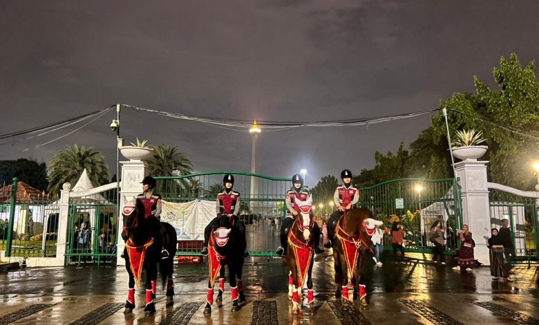 Jakarta — Kehadiran satuan Polsatwa berkuda Polri menyedot perhatian masyarakat yang memadati kawasan Monumen Nasional pada malam pergantian Tahun Baru, Rabu (31/12/2025).