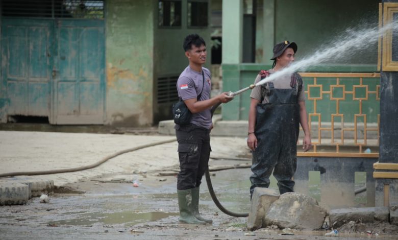 Polri Bantu Kuras Air Yang Merendam Kompi Senapan A Yonif 111 / Karma Bakti, Aceh Tamiang
