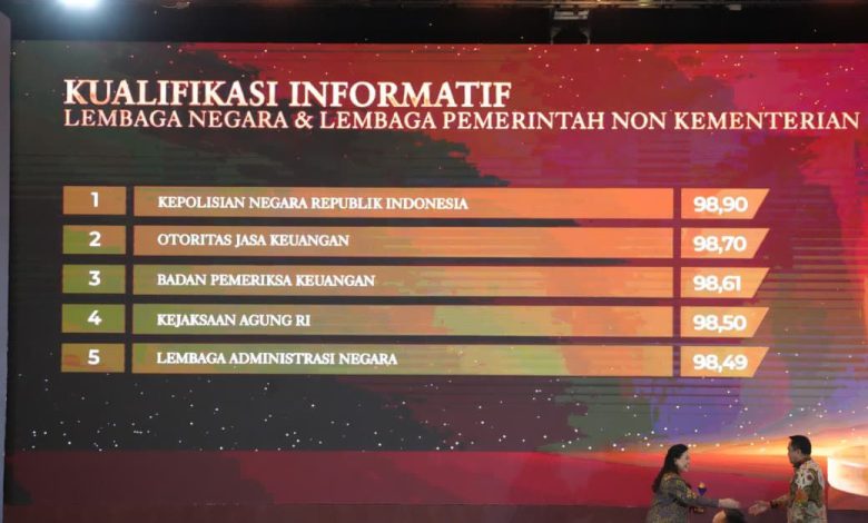 Jakarta, mimbar.co.id – Kepolisian Negara Republik Indonesia (Polri) meraih peringkat pertama nasional dalam Monitoring dan Evaluasi Keterbukaan Informasi Publik (Monev KIP) Tahun 2025 yang diselenggarakan oleh Komisi Informasi Pusat RI. Polri memperoleh nilai 98,90 dengan predikat Informatif, tertinggi pada kategori Lembaga Negara dan Lembaga Pemerintahan Non Kementerian (LNNK).